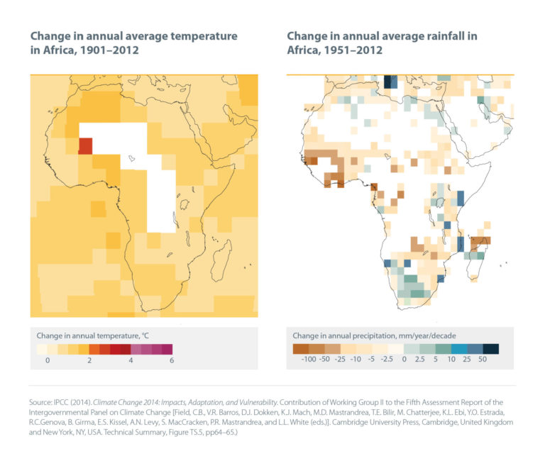 Most areas of Africa lack sufficient data to draw conclusions about trends in annual rainfall over the past century. But where data is available, these indicate that rainfall patterns are changing. A very likely decrease in average annual rainfall has occurred in some parts of western Africa, with an observed drop in average annual rainfall of approximately 25–50 mm each decade from 1951–2010.18 Some parts of southern and eastern Africa have very likely experienced increases in average annual rainfall of 5–50 mm each decade (Figure 2). However, rainfall trends in eastern Africa vary greatly over time and location. Some assessments suggest that wet seasons will be more intense and droughts less severe over eastern Africa by the end of the century, which indicates a reversal of the observed increase in droughts and heavy rainfall during the past 30 to 60 years.