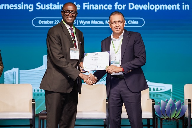 At the AADFI-ADFIAP Joint International CEO Forum 2025, held from October 22 to 24, 2025, in Macau SAR, China, Dr. Eugene Itua, CEO of Natural Eco Capital and Executive Director of the Africa Green Economy and Sustainability Institute (AGESI), was honoured with a Certificate of Appreciation by Mr. Thimal Perera, CEO of DFCC Bank PLC, Sri Lanka, for his outstanding contribution as a panelist in Session 1: “Harnessing Sustainable Finance for Development – Exploring Innovative Financing Models to Accelerate Sustainable Development in Asia-Pacific and Africa”.