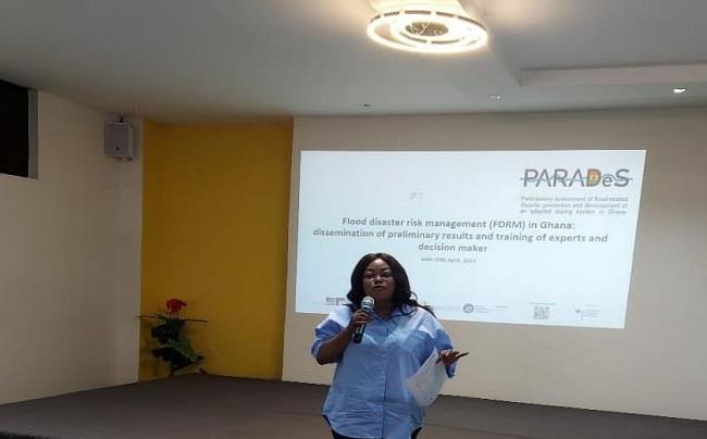 The Director of Climate and Disaster Risks Reduction at NADMO, Mrs. Charlotte Norman, was particularly excited about the flood labeling tool product of the PARADeS project. “It entails labelling of houses in in accordance with whether they are in danger from floods and the level of danger, whether they are resilient structures or not. So that people who go to live in those areas, understand what risks they are taking,” she explained.