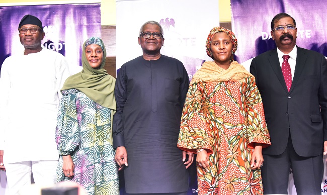 L-R: Chairman, FBN Holdings Plc, Femi Otedola; Executive Director, Operations, Dangote Sugar Refinery Plc, Mariya Aliko Dangote; President/CE, Dangote Industries Limited Aliko Dangote; Group Executive Director, Commercial Operations, Dangote Industries Limited, Fatima Aliko Dangote; Vice President, Oil & Gas, Dangote Industries Limited, Devakumar Edwin; during the World Press Conference on the expansion of Dangote Petroleum Refinery to 1.4m bpd capacity, Polypropylene production from 900,000mt to 2.4m mt per annum, further enriching the production of linear alkylbenzene a key ingredient for the production of detergent, and additional production of base oils, in Lagos on Sunday, October 26, 2025.